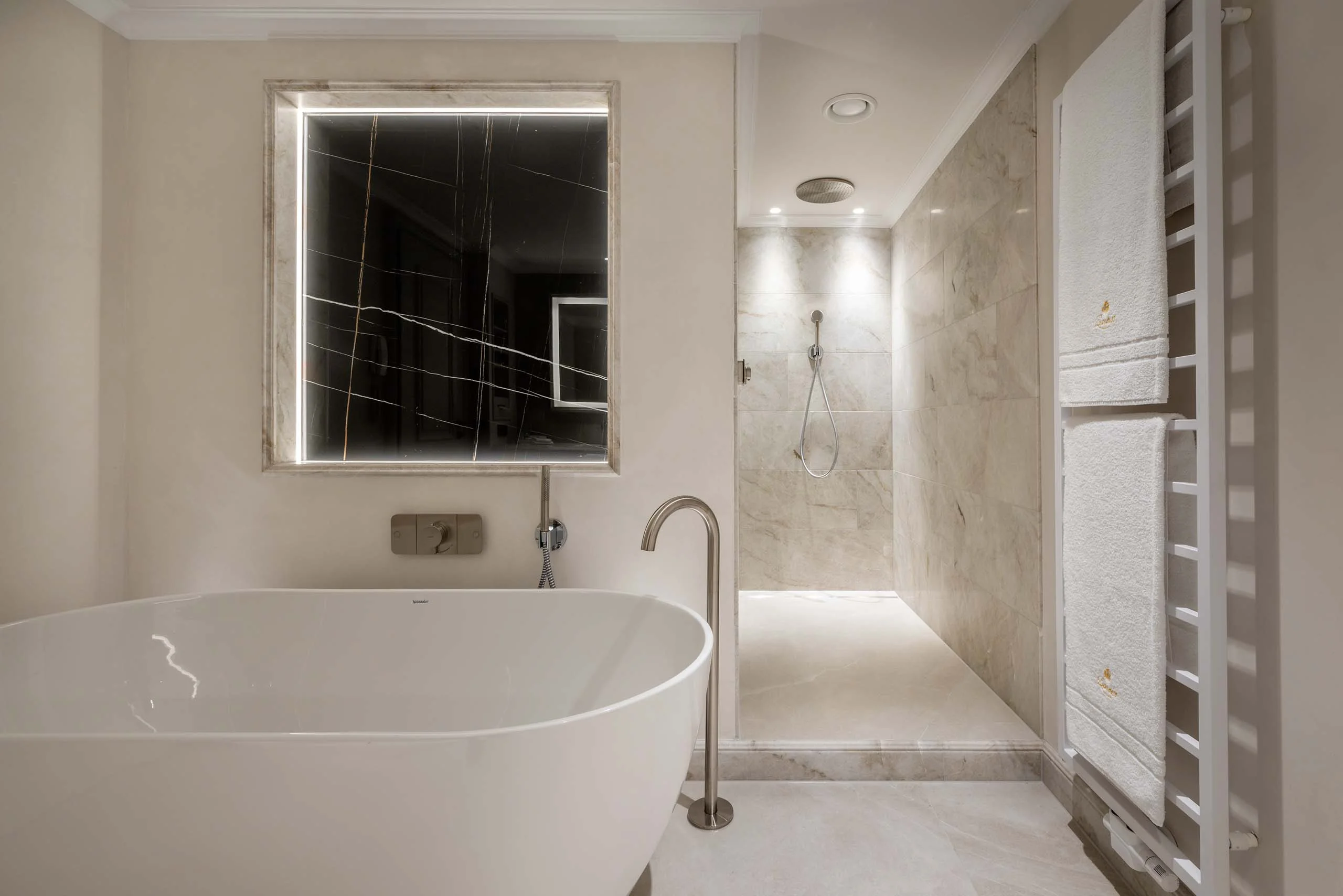 Ineinandergehendes Doppel- und Einzelzimmer mit großer Dusche, Doppelwaschbecken, separatem Bidet/WC, großzügigem Wohnbereich und Gartenterrasse.