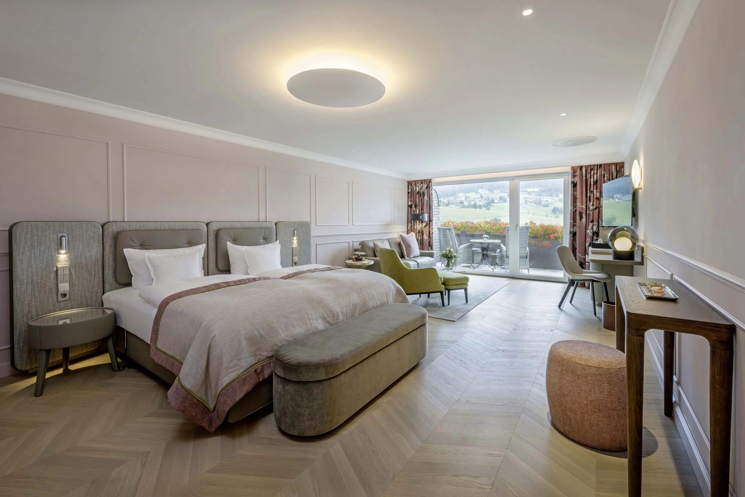 Großes Doppelzimmer mit großzügigem Bad (Dusche und/oder Badewanne), geräumiger Wohnecke mit Sofa und Südbalkon.